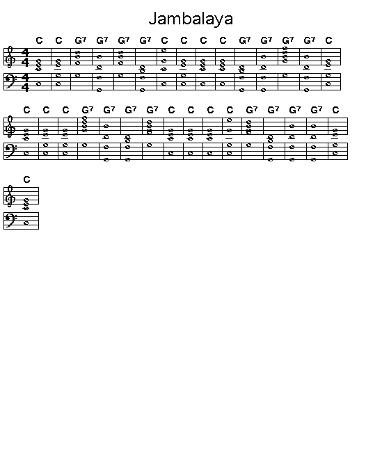 Chord progression of Hank Williams' Jambalaya, a famous country and western song. This song has possibly the simplest harmony of any popular tune, utilizing only the C triad and the G7 chord..