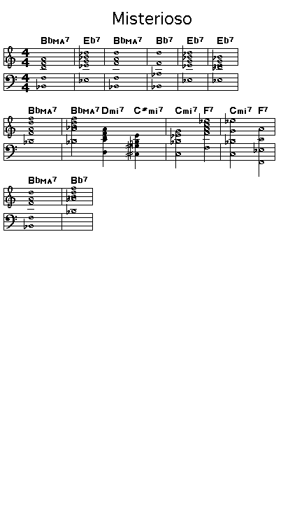 Chord progression for Thelonious Monk's blues Misterioso. The chord sequence is very unusual since Monk substitutes Major seventh chords at places in the blues sequence (like the beginning) where the sound of a dominant seventh chord is nearly universally expected. Despite delaying the introduction of the dominant sound for as long as possible, Misterioso still sounds like a well-formed blues. Monk was one of the few who could make this work..