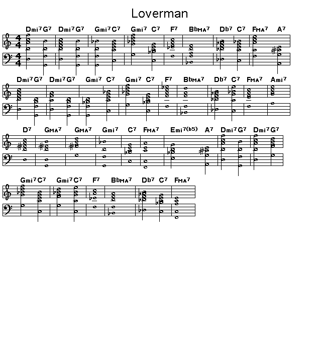 Chord progression for Ram Ramirez's "Lover Man". "Lover Man" was a favorite song of Sarah Vaughan's. Charlie Parker also did a notorious version of this in his last performances done for Dial Records just before he was committed to Camarillo State Hospital in California..