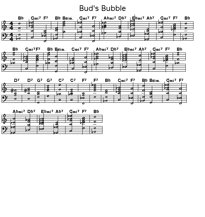 Chord changes for Bud Powell's Bud's Bubble. This is perhaps the fastest played progression on SongTrellis. Quarter notes are played at 300 beats per minute.