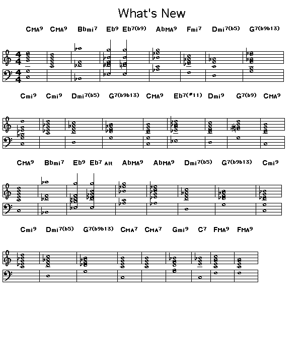 Chord changes for Bob Haggard's What's New. This tune is usually thought of as a 32-bar form. This version which the John Coltrane Quartet used on their "Ballads" album doubles the duration of the form so that we have a 64-bar form where each half-bar of the original progression is treated as a full bar in 4/4. This tune sounds just fine if you double the tempo. This version uses quarter tone tempo of 96 beats per minute.