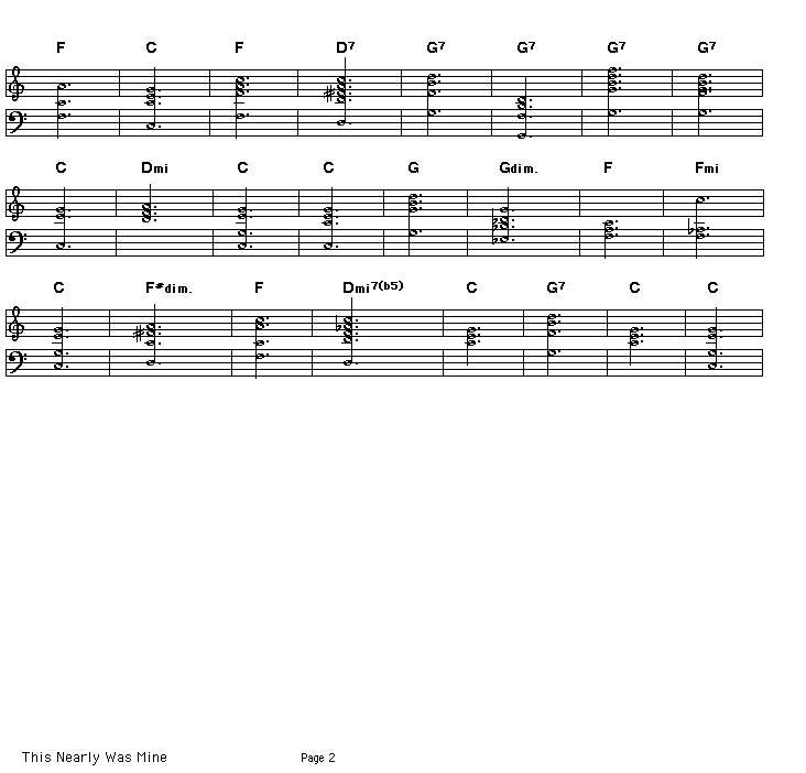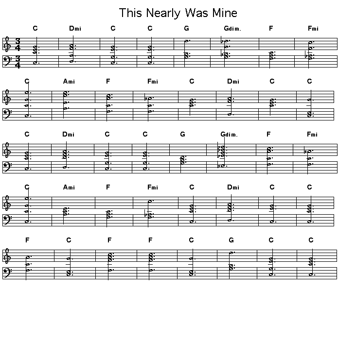 Chord progression for Richard Rodgers' This Nearly Was Mine. This is from the musical "South Pacific". The only jazz version I know of this is a wonderful performance by pianist Cecil Taylor, bassist Buell Neidlinger and drummer Dennis Charles recorded on Cecil's album "The World Of Cecil Taylor". This was perhaps the last recordings of Cecil playing a show tune.