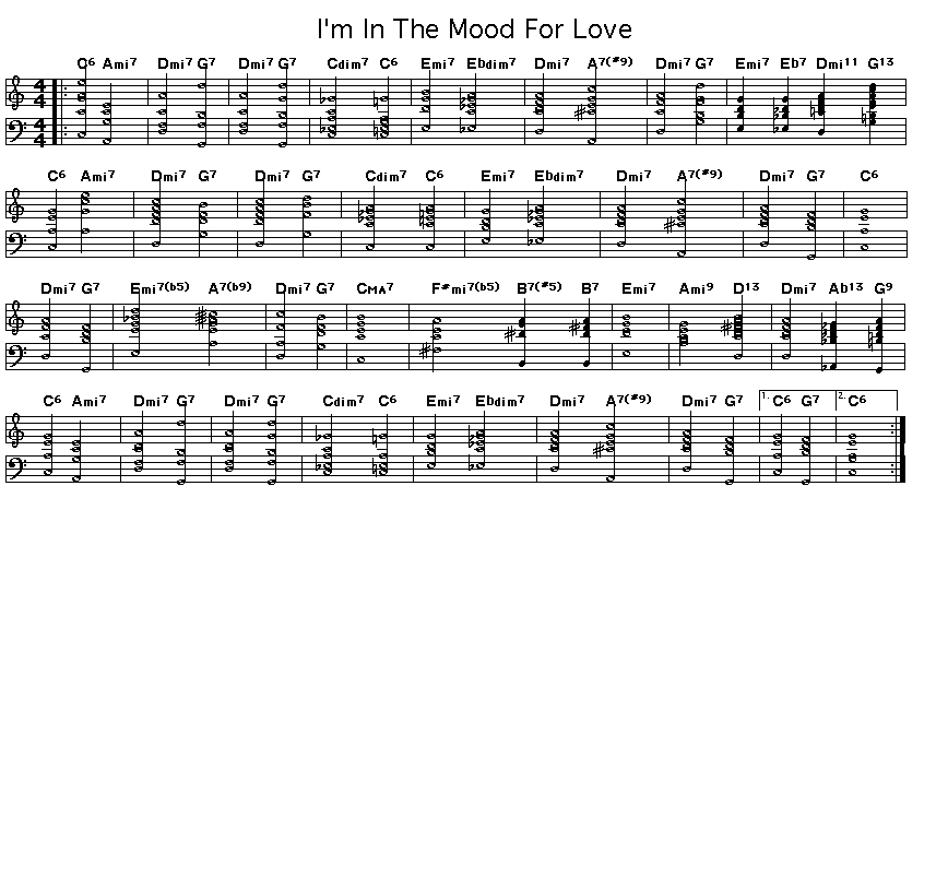 Chord changes for Jimmy McHugh's I'm In The Mood For Love. James Moody did a great tenor sax improvisation on this. Eddie Jefferson wrote a lyric using Moody's improvised melody. This song was a big hit for King Pleasure and was called "Moody's Mood For Love".