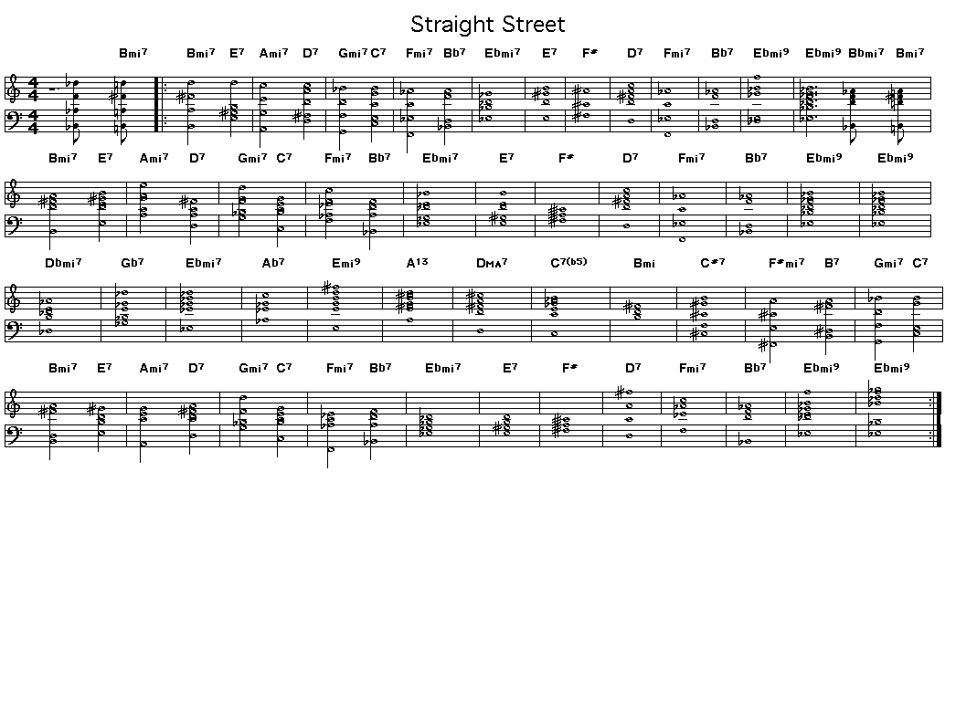 Chord changes for John Coltrane's Straight Street. The form is unusual because although it uses the 'AABA' structure, the A and B sections are 12 bars in length rather than more usual 8 bar lengths.