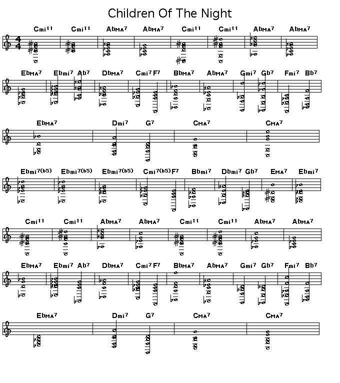 Chord progression for Wayne Shorter's Children Of The Night. This was one of the songs Shorter wrote for Art Blakey and the Jazz Messengers when he was the musical director for that band.