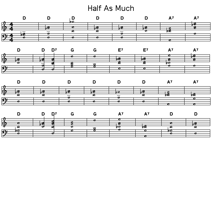 Chord changes for Half As Much, written by Curly Williams and first performed by Hank Williams, Sr. Hank's version is wonderful and pure country. Ray Charles later did a version with jazz band accompaniment on his "Modern Sounds In Country and Western Music" album that is quite different but equally great.