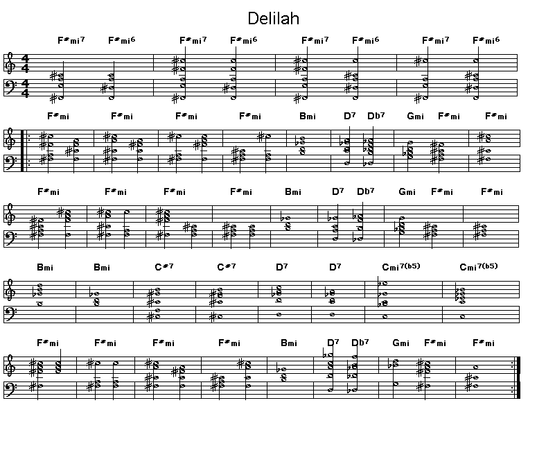 Chord progression for Victor Young's Delilah. The most notable jazz version of this was done by the Clifford Brown-Max Roach Quintet in the mid-50's. Vibist Bobby Hutcherson recently did a very nice rendition on his album "Skyline".