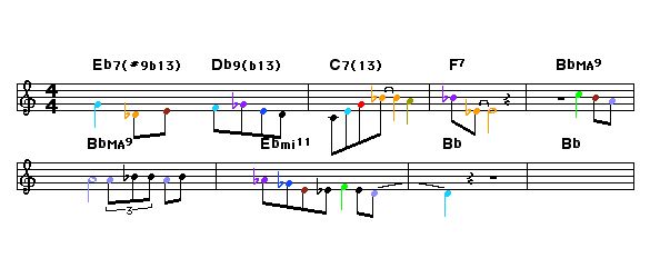 I took the last 8 measures of Charlie Parker's solo on Yardbird Suite and encoded that melody using the new Tunetext Melodic Motion operators. Then I extracted that Tunetext specification and pasted that into the melody voice of a Tunetext score whose Chord voice regenerates with different chords everytime the Tunetext is refreshed.