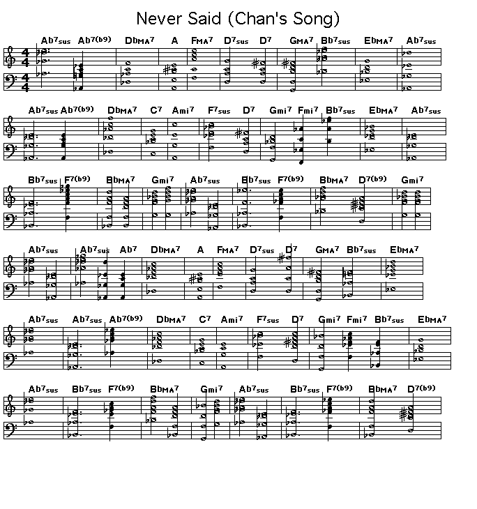 These are the chord changes with hi-hat and ride cymbal accompaniment for Never Said (Chan's Song), a composition that Herbie Hancock wrote for the movie Round Midnight, which Stevie Wonder wrote lyrics for.