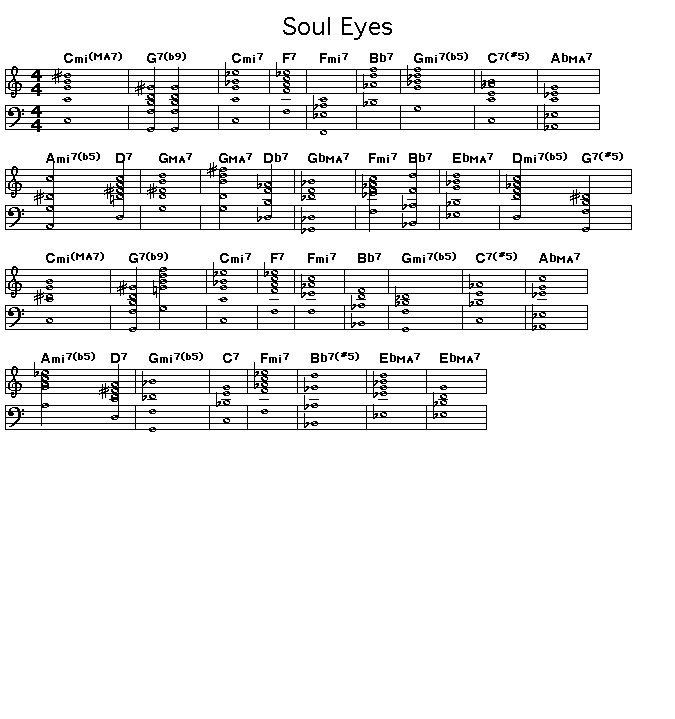 Chord progression for Mal Waldron's Soul Eyes. The John Coltrane Quartet did a definitive version of this song on Coltrane's Impulse Records album "Coltrane". Waldron was Billie Holiday's piano accompaniest for many years and played with Eric Dolphy in the early 60's.