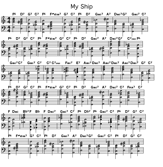 New Printable Scores for chord progressions My Ship, Willow Weep For Me, Darn That Dream, Song For My Father, Stella By Starlight, On Green Dolphin Street, People Will Say We're In Love, As Time Goes By, Satin Doll, I Mean You, Isn't It Romantic, Nefertitit, Nostalgia In Times Square, Now's The Time, One Finger Snap, Organ Grinder and Ornithology. Also Speak Low, Speak No Evil, Chelsea Bridge, My Romance, Out Of Nowhere, Someday My Prince Will Come, Lonnie's Lament, Gloria's Step, Solar, and 502 Blues. There are responses to this message: