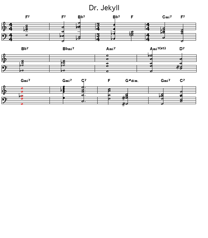 Chord progression for Jackie McLean's "Dr. Jekyll" sometimes alternatively titled "Dr. Jackyll". The most famous performance of this tune was by the Miles Davis Sextet with John Coltrane and Cannonball Adderly on the album "Milestones".