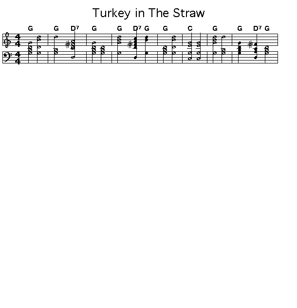 Chord progression for the American fiddle tune Turkey In The Straw. Actually i think this is the progression for only the first half of the tune. If you know the changes for the second half, let me know.