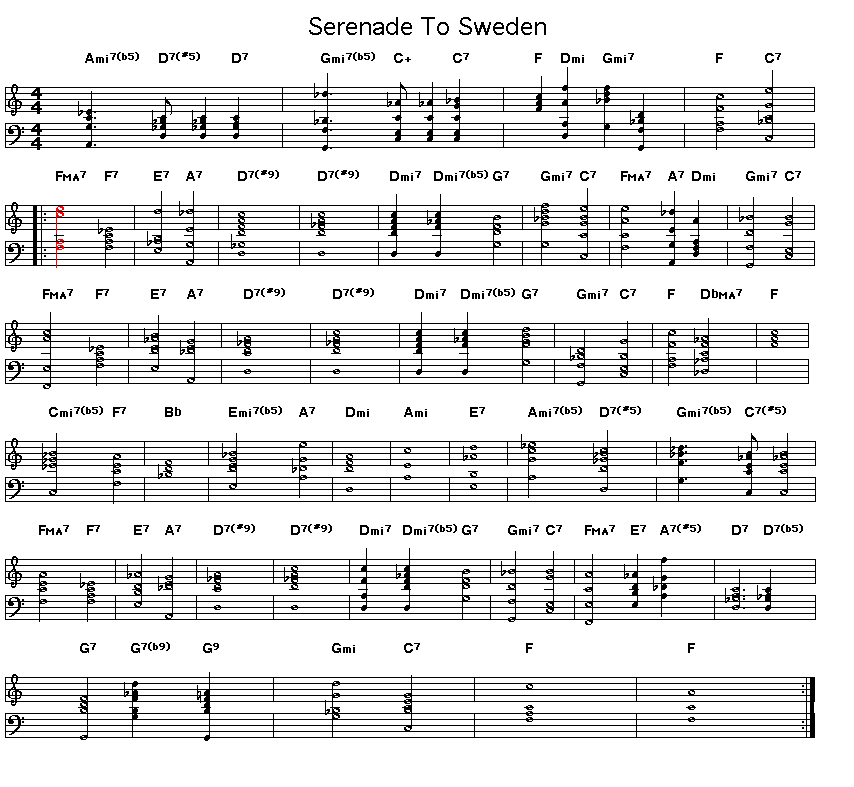 Chord changes for Duke Ellington's Serenade To Sweden. Duke wrote this in 1939 after his Orchestra's second tour of Sweden. I have never heard the original with the Ellington Orchestra, but Jimmy Rowles and Stan Getz do a masterful job with this on their album The Peacocks as does Lew Tabackin on his "Desert Lady" album.