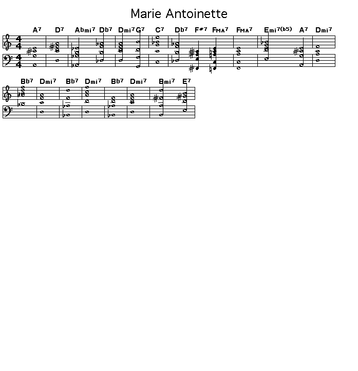 Chord progression for Wayne Shorter's Marie Antoinette with piano and percussion accompaniment. This tune was first performed on Freddie Hubbard's album "Ready For Freddy".
